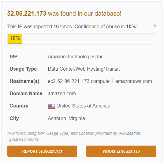 Taking a look at the IP the requests were coming from, we can see it belongs to AWS, most probably an EC2 instance.